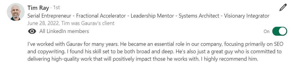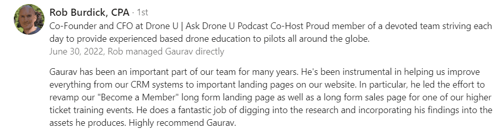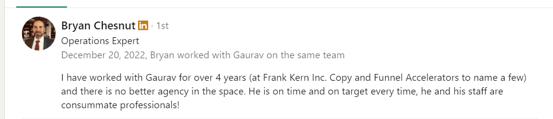 "I have worked with Gaurav for over 4 years (at Frank Kern Inc.) and there is no better agency in this space...